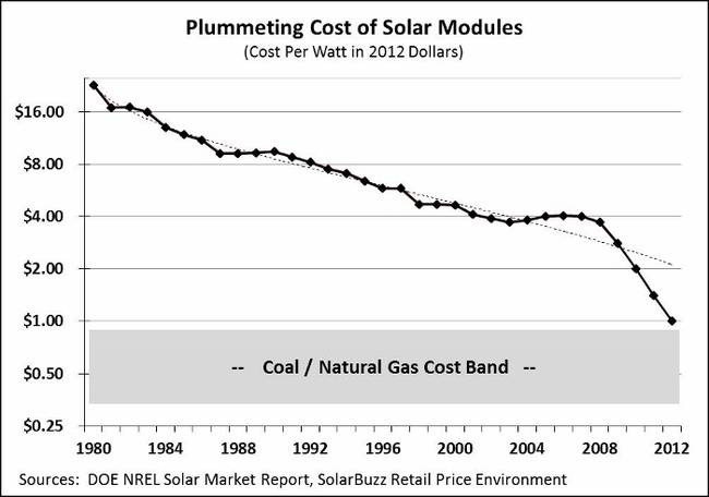 Графік падіння цін на сонячні панелі — з 1980 по 2012 роки. Рівень українських субсидій відповідає цінам п’яти-восьмирічної давності
